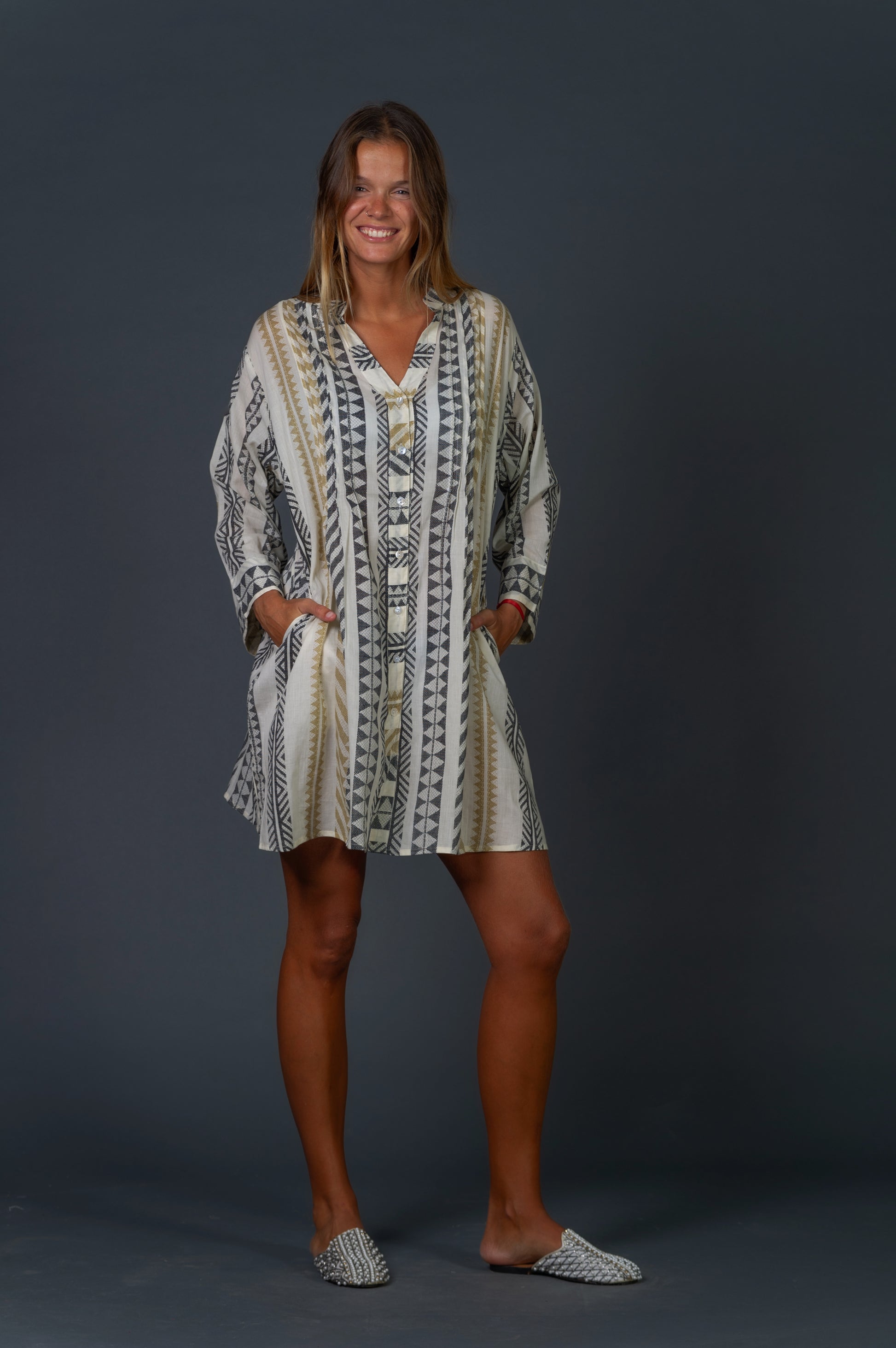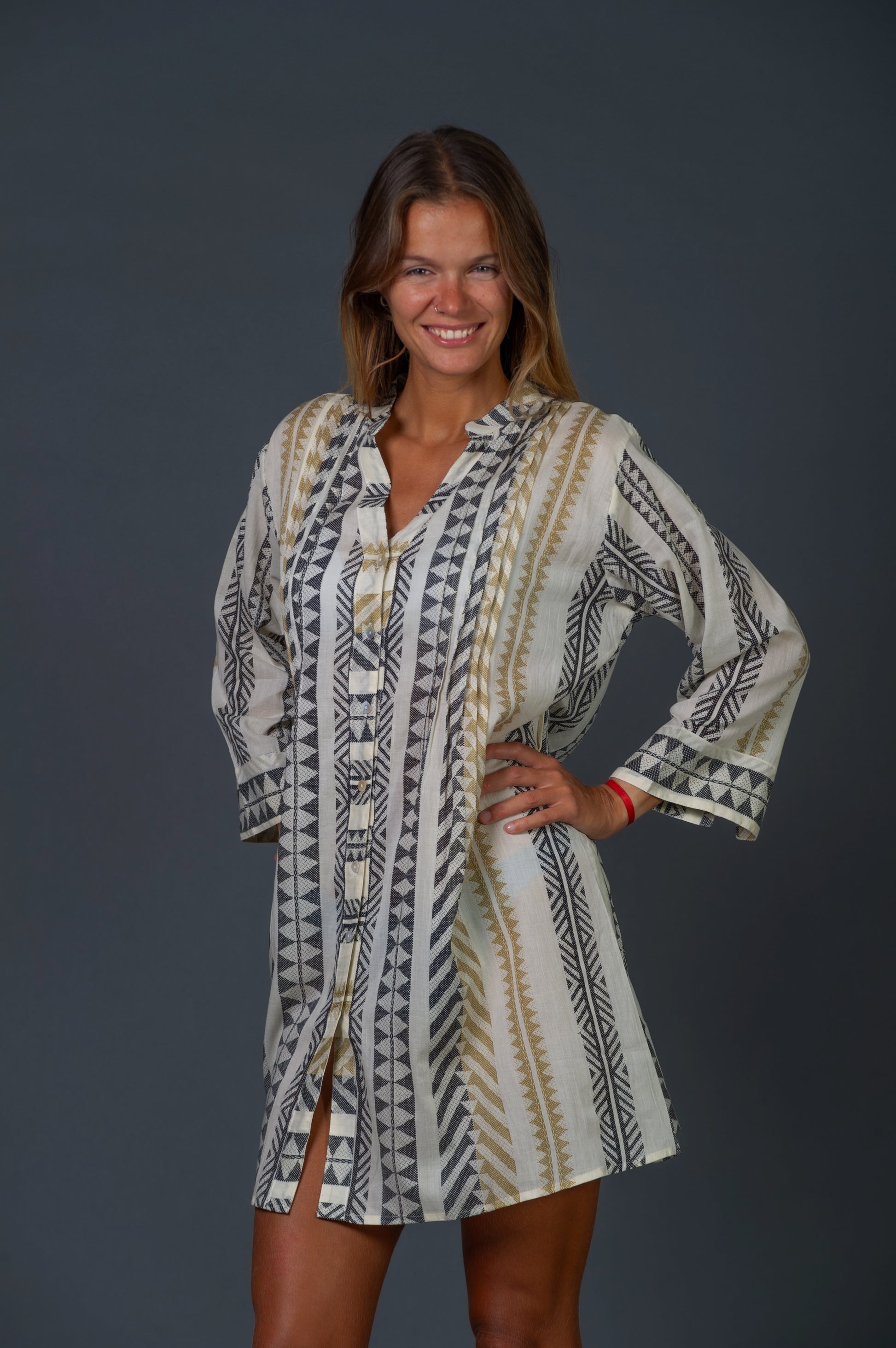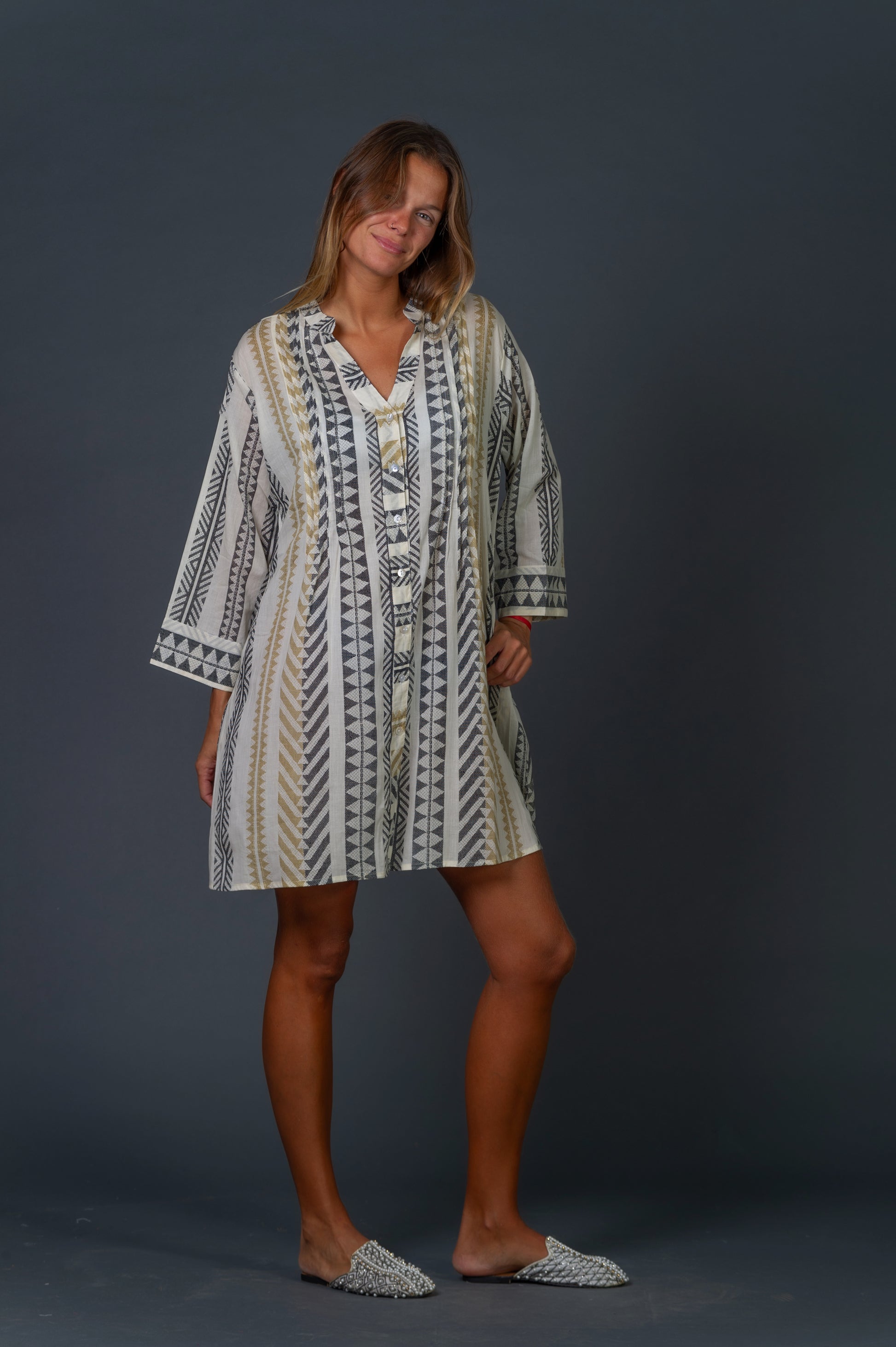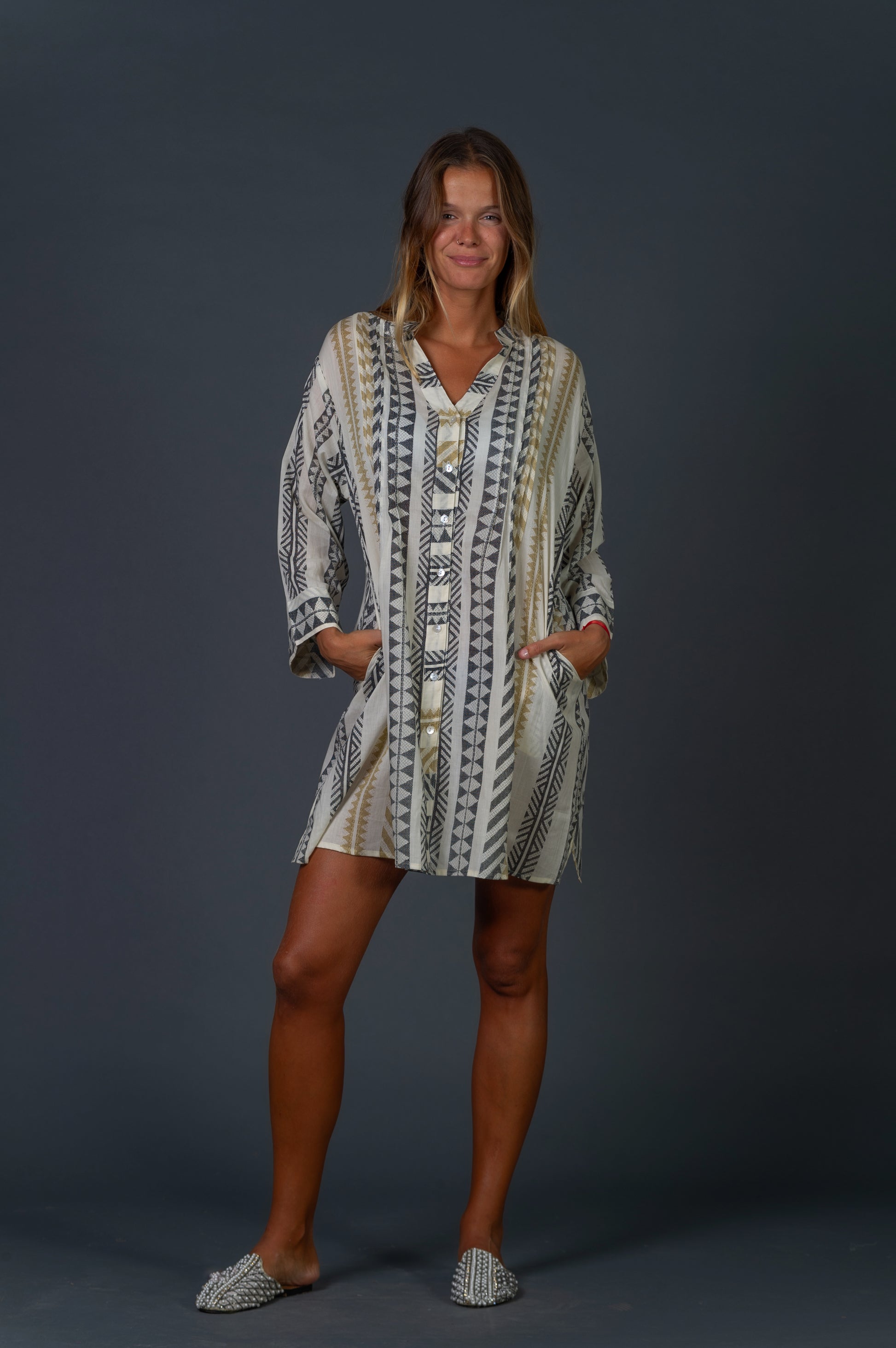 Camisola estampada negro y beige con fondo color hueso.