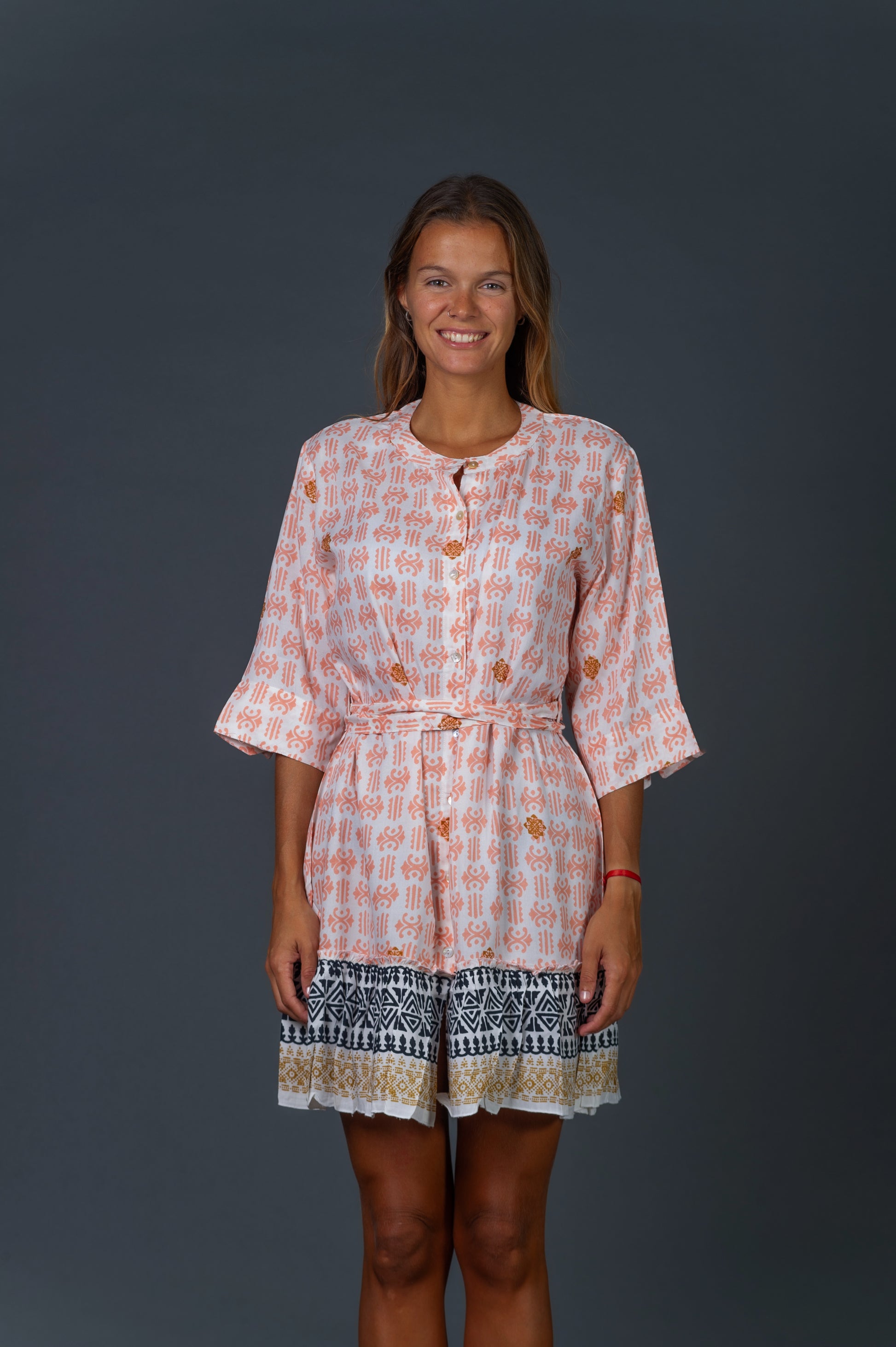 Vestido corto estampado en tonos salmón y fondo blanco.